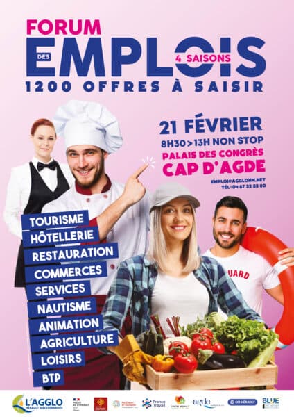 L’agglo Hérault Méditerranée s’engage pour l’emploi sur son territoire et organise, samedi 21 février, le Forum des Emplois au Palais des Congrès du Cap d’Agde, de 8h30 à 13h, avec le soutien et la participation de la DDETS de l’Hérault (Direction départementale de l’emploi, du travail et des solidarités), le Préfet de l’Hérault, la Région Occitanie, France Travail, la ville d’Agde, la Mission Locale Centre Hérault, la CCI Hérault et l’agence d’attractivité BLUE.